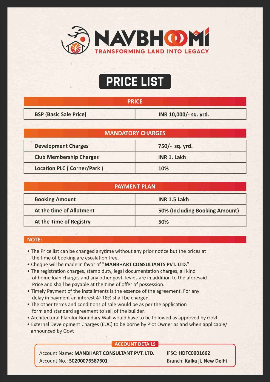 With immediate possession, clear titles, and excellent connectivity to major hubs, Navbhoomi Enclave presents a golden opportunity for both investors and homeowners. The project embodies trust, transparency, and long-term value — the core principles of Manbhart Consultants Pvt. Ltd. Whether you’re looking to build your dream home or secure a high-growth investment, Navbhoomi Enclave promises a lifestyle of comfort, security, and prosperity in one of India’s most promising real estate destinations.